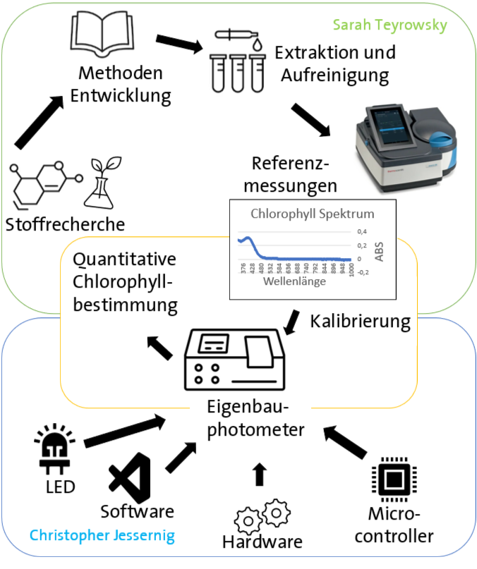Beim chemischen Teil des Projekts werden zu Beginn verschiedene Lebensmittel ausgewählt, aus diesen soll der Chlorophyllgehalt gemessen werden. Um das Chlorophyll zu erhalten, werden eigene Methoden entwickelt. Diese Methoden werden dann für die Extraktion und Aufreinigung der Proben verwendet, welche dann mit dem Laborphotometer gemessen werden und als Referenzmessungen für das Eigenbauphotometer dienen.