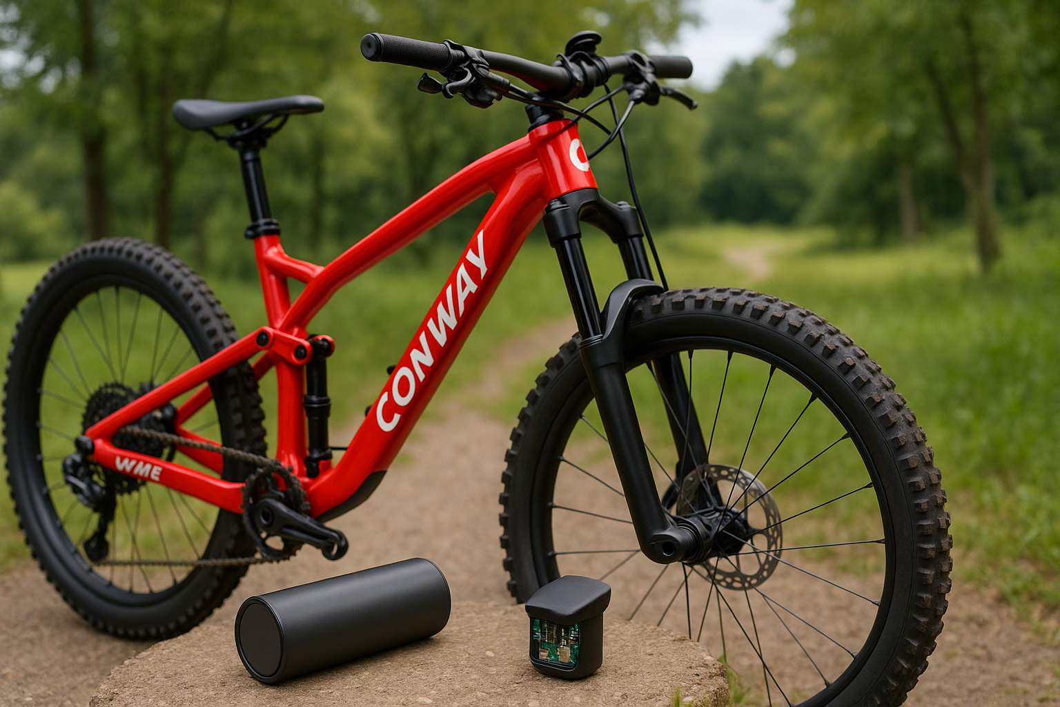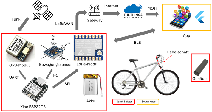 Das zentrale Element des Projektes ist ein Mikrocontroller-System mit einem LoRa-Modul, einem GPS-Modul und einem Bewegungssensor. Das System wird mit einem externen Lithium-Akku versorgt, der sich im Gehäuse befindet und jederzeit wieder aufgeladen werden kann. Das Gehäuse ist passgenau für den Gabelschaft des Fahrrads Conway WME 227 konstruiert.