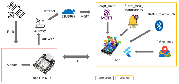 Um den Benutzer/die Benutzerin schon bei kleinsten Erschütterungen des Fahrrads zu warnen, gibt es eine Handy-App. Diese wird mit Flutter erstellt. Sollte das BSS einen Diebstahl erkennen, so wird der aktuelle Standort kontinuierlich übertragen. Dieser wird auf einer interaktiven Landkarte visuell dargestellt. Außerdem wird das System automatisch aktiviert, wenn es keine Bluetooth-Verbindung mehr zum Handy hat, sich der Besitzer/die Besitzerin also vom Fahrrad entfernt. Und deaktiviert, wenn wieder eine Bluetooth-Verbindung besteht.