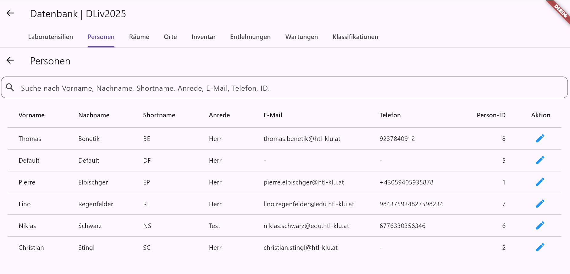 Deutsch Mit dem Datenbanksystem wird eine komfortable Verwaltung der Laboreinrichtung ermöglicht. Das Inventar wird um zusätzliche Metainformationen (Gerätetyp, Hersteller, Lagerort, Reparaturen, ...) ergänzt, um eine strukturierte Darstellung und Auswertung zu ermöglichen. Die Inventarisierung kann effizient mittels Barcode-Lesegerät durchgeführt werden und der Zugriff auf die Datenbank wird durch ein Berechtigungssystem gesteuert. Die Web App und die Mobile App bieten denselben Leistungsumfang.