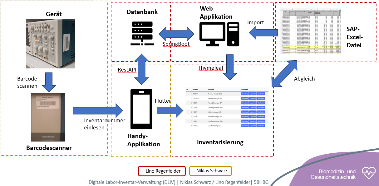 Niklas Schwarz implementiert eine RESTful-API für den Datenbankzugriff und entwickelt eine Handy App zur Datenverwaltung mittels Flutter. Darüber hinaus gestaltet er das mobile Nutzererlebnis so, dass Inventardaten schnell und intuitiv erfasst werden können. Er stellt sicher, dass die API stabil, gut dokumentiert und effizient auf Anfragen (Barcode-Scanner, Inventarnummer der Laborutensilien) der mobilen Anwendung reagiert.