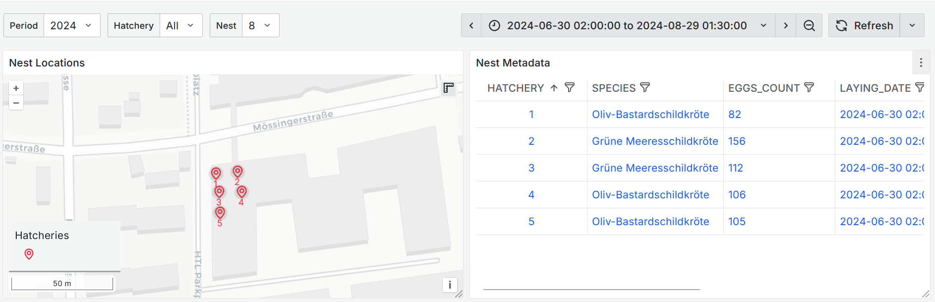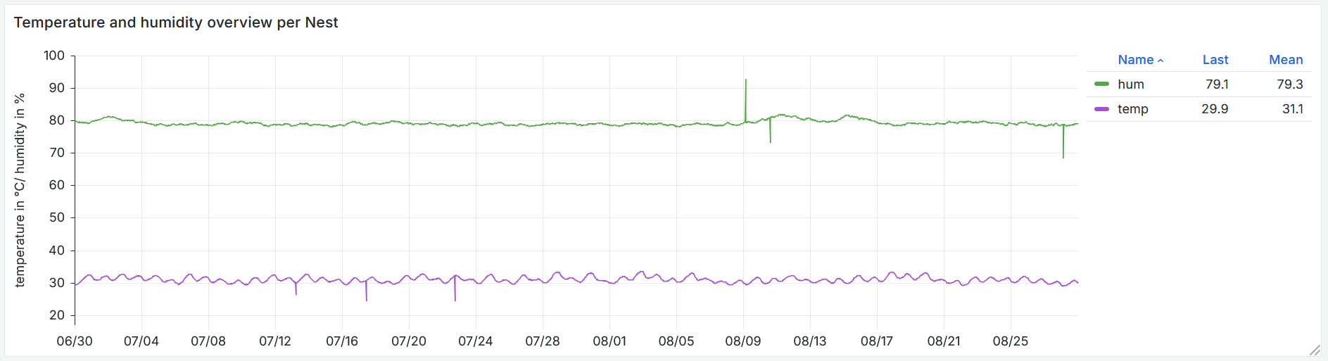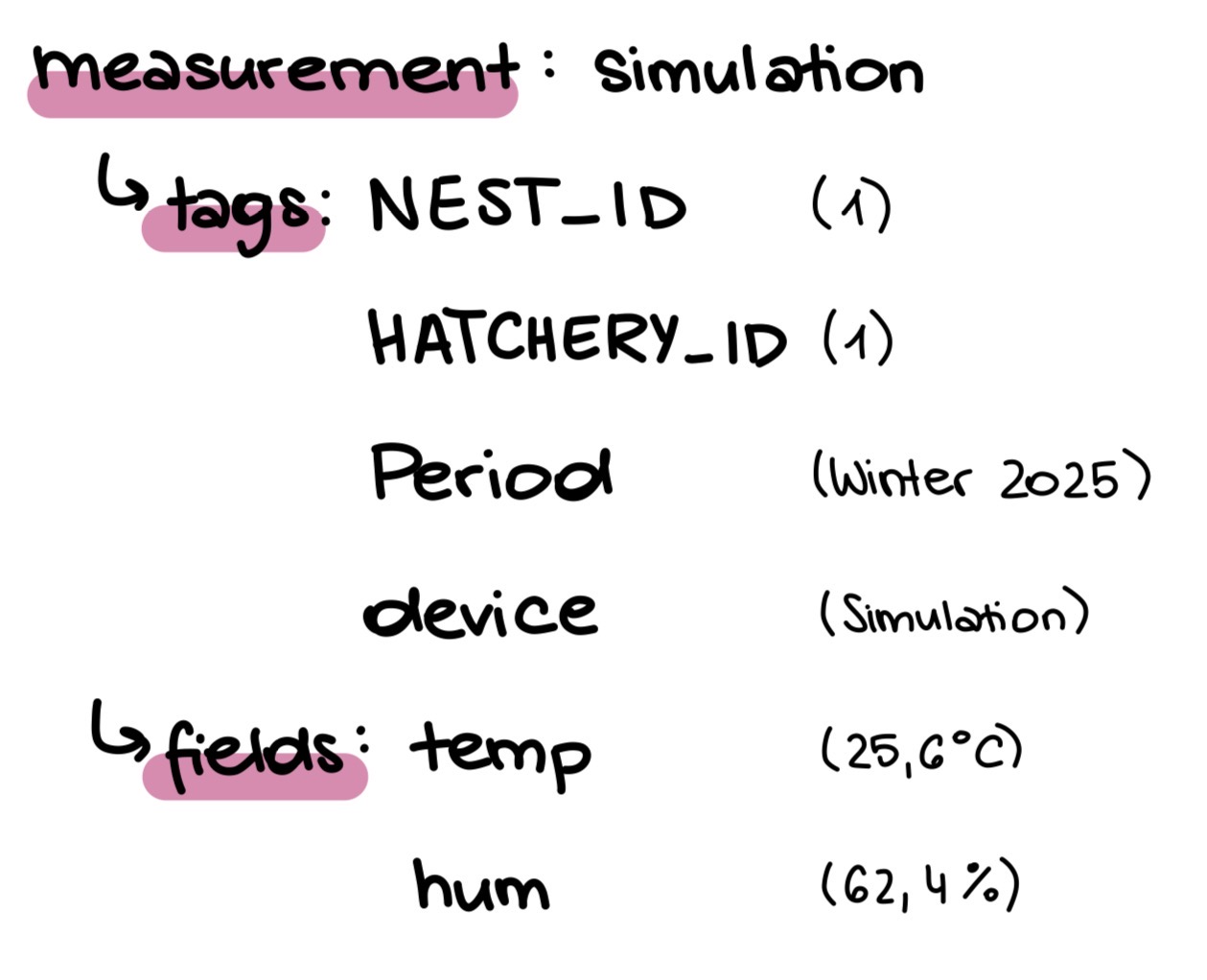 Die zeitabhängigen Messwerte werden in einer Zeitreihendatenbank gespeichert. Dazu verwenden wir InfluxDB – eine Open-Source-Datenbank, die sich besonders für die Verarbeitung von Sensordaten eignet. Ein wesentlicher Nachteil dieser Datenbank besteht darin, dass sie nur begrenzt Metadaten (zusätzliche Informationen) speichern kann. Daher kommt ergänzend eine MySQL-Datenbank mit drei Tabellen zum Einsatz. In dieser werden Informationen, wie die Menge an Eiern im Nest, Menge an geschlüpften Jungtieren, usw. gespeichert.