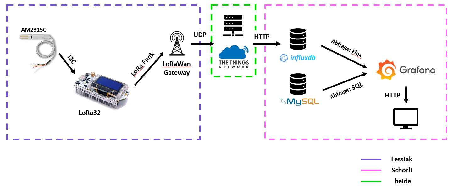 Der Systemstrukturplan dient dazu einen Überblick über das Projekt, seine Technologien und seine Komponenten zu erlangen. Als Sensor dient ein Temperatur- und Luftfeuchtigkeitssensor - der AM2315C - , dessen Daten von einem LoRA32-Modul verarbeitet werden. Die Übertragung vom LoRa32-Modul zur InfluxDB funktioniert über LoRaWAN, wofür The Things Network eingesetzt wird. Zur Speicherung der Metadaten wird eine MySQL-Datenbank eingebunden. Die Zeitreihendaten und die Metadaten werden kombiniert und mittels Grafana dargestellt. Ebenso wird dadurch ein Alertingsystem erstellt und Grafana fungiert ebenso als eine Art Benutzeroberfläche.