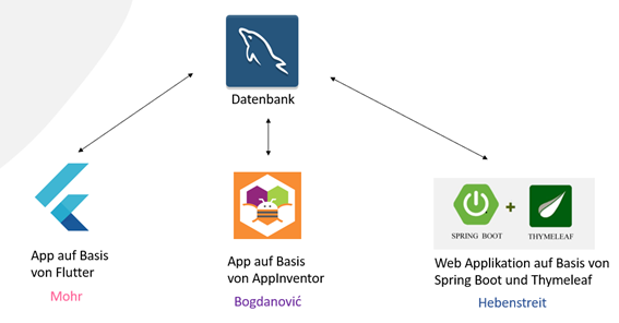 Unsere Systemarchitektur basiert auf einer zentralen Datenbank, die als Kern für alle weiteren Komponenten dient. Darauf aufbauend entwickeln wir drei unterschiedliche Zugriffswege: eine App mit Flutter, eine weitere App mittels AppInventor und eine Website auf Basis von Spring-Boot und Thymeleaf. Dadurch können Nutzer/innen unabhängig von der Plattform Mitfahrgelegenheiten suchen bzw. anbieten. Die Datenbank stellt in diesem Falle sicher, dass alle Anwendungen stets sychronisiert und das nur die aktuellen Informationen bereitgestellt werden.