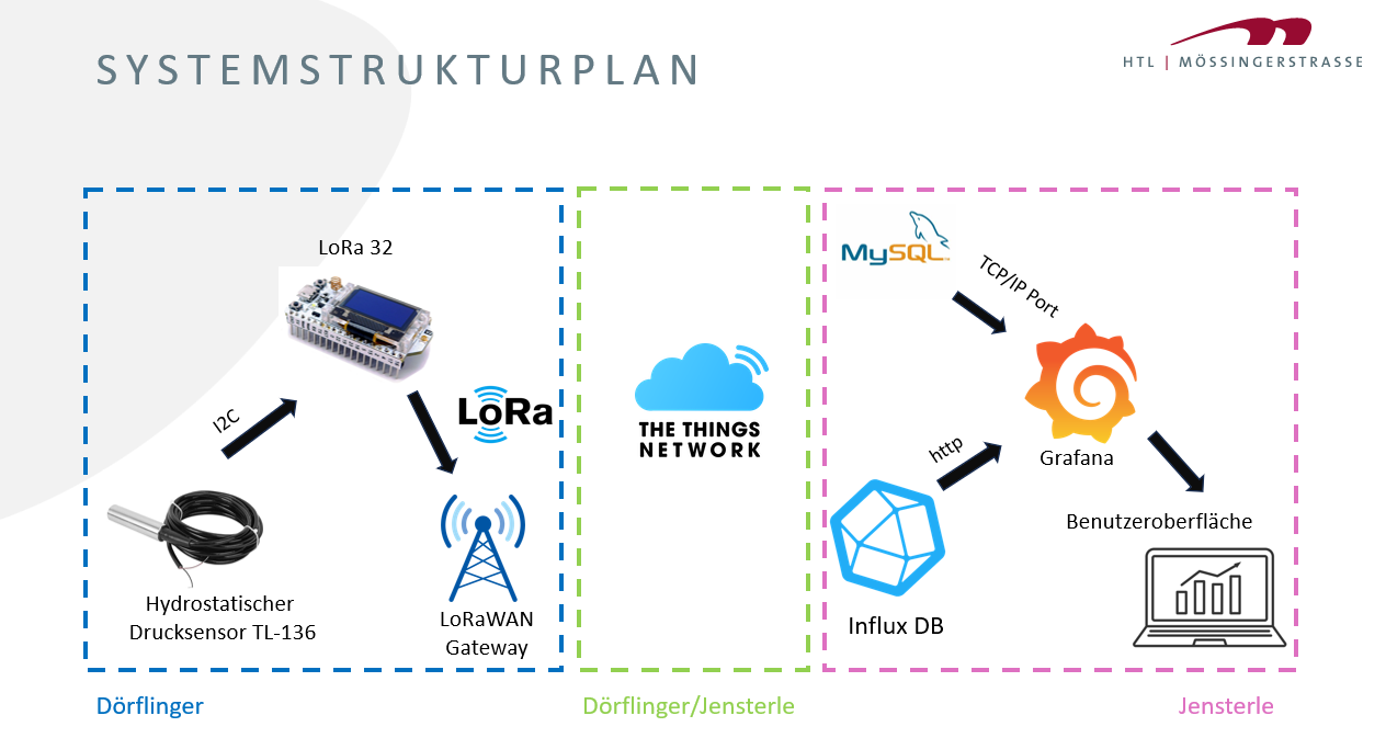 Für die Wasserstandsüberwachung wird LoRaWAN eingesetzt,da diese Funktechnologie eine energieeffiziente und weitreichende Datenübertragung ermöglicht. Ein Wasserstandssensor misst den aktuellen Pegel, ein LoRa-fähiger Sensorknoten überträgt die Daten drahtlos an ein Gateway, das sie an den Server weiterleitet. Durch den geringen Energieverbrauch und die große Reichweite eignet sich LoRaWAN ideal für Messungen in Grundwasserschächten, in denen WLAN aufgrund der unterirdischen Lage nicht zuverlässig funktioniert.