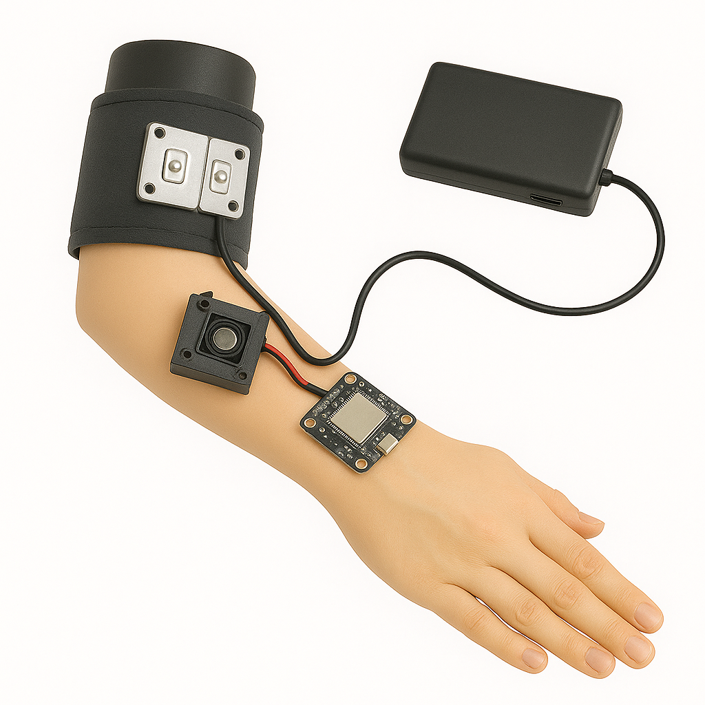 English Trainees who are learning the Korotkow method for measuring blood pressure currently have no simple way of checking the accuracy of their measured values. The only devices available on the market simulate blood pressure palpatorically. In addition, there are full-body mannequins used for training purposes on which pulse, blood pressure, blood sampling, and infusions can be practiced. The aim of our thesis is to develop a device that allows blood pressure measurement. The aim of our thesis is to develop a device that enables practicing blood pressure measurement. The blood pressure simulated by a loudspeaker can be preset in an app before the measurement, so that Korotkoff sounds are reproduced between the systolic and diastolic values. The training arm is to be designed to be robust and realistic. Furthermore, our project should also be usable for demonstrating blood pressure measurement. The blood pressure set in the app should be comparable to the measured blood pressure. The circuitry and power supply will be integrated into the arm model. The sensors will be covered with silicone skin so that they are not visible from the outside.