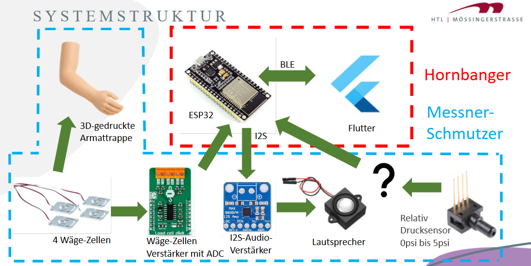 Sophia Messner-Schmutzer beschäftigt sich mit der Hardware des Projektes. Dies beinhaltet die Konstruktion der Armattrappe, das Designen und Herstellen der Schaltung. Die Schaltungen beinhalten mehrere Messbrücken mit Kraftsensoren. Die gemessene Kraft, welche durch die Blutdruck-Manschette ausgeübt wird, wird in eine Spannung umgewandelt und die Informationen vom ESP32 weiterverarbeitet. Der Lautsprecher wird von dem Mikrocontroller so angesteuert, dass er ab dem systolischen Druck die Korotkow-Geräusche simuliert und ab dem diastolischen Druck wieder einstellt.