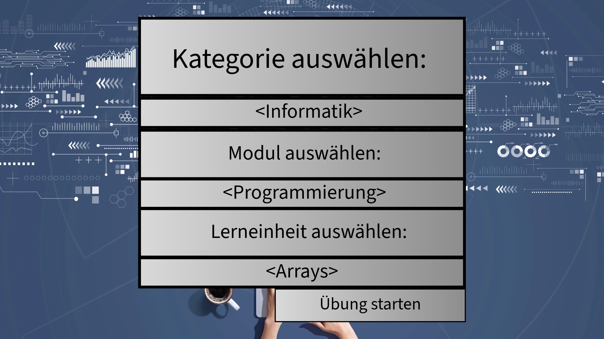 In dieser Beispielansicht wählen Nutzer eine Kategorie, ein Modul und eine Lerneinheit aus.