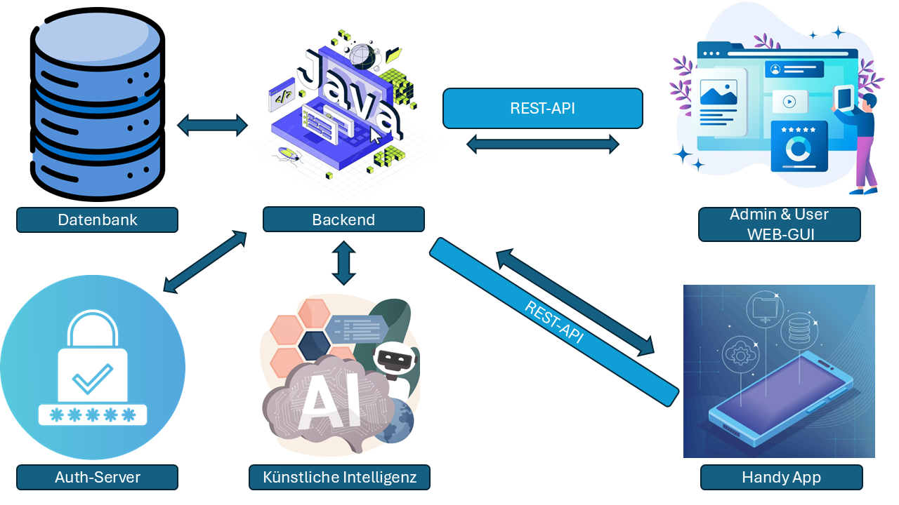 Der Systemstrukturplan zeigt in kompakter Form, wie die einzelnen Teile des Projekts zusammenarbeiten: Datenbank, Backend, Auth-Server, KI-Modul sowie Web-Oberfläche und Handy-App. Die Grafik veranschaulicht den Datenfluss über die REST-API und gibt einen schnellen Überblick über die komplette Architektur des Systems.